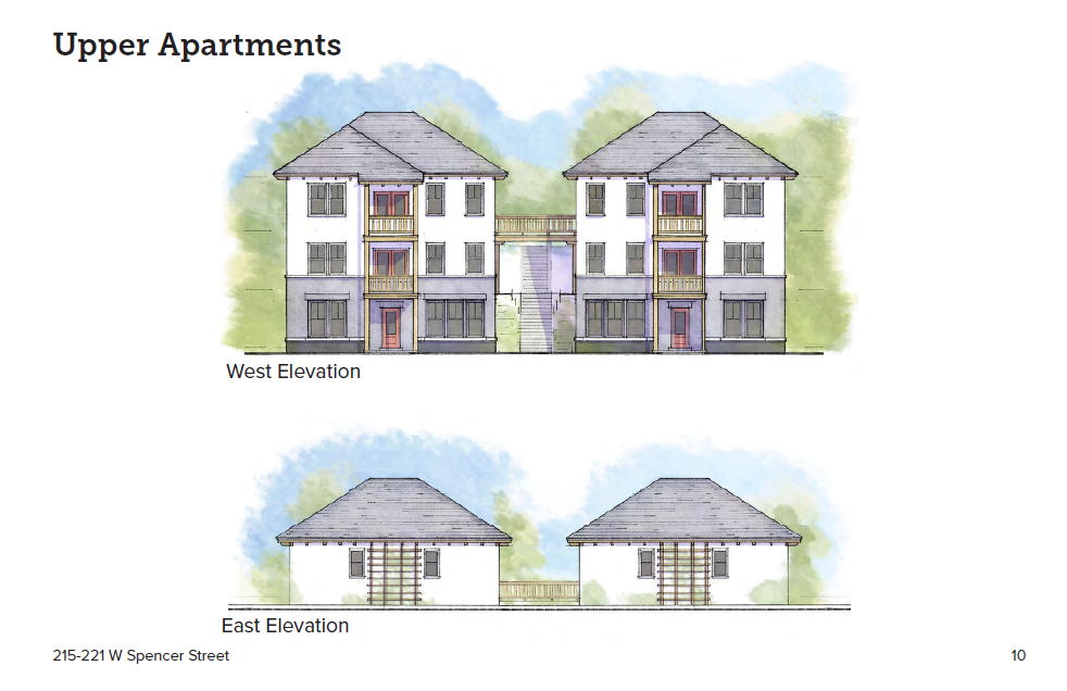 […] 215-221 West Spencer Street is a steeply sloped 0.47 acre site that was previously home to a multistory apartment building. The building had fallen into disrepair by the early 2000s, and the city bought the property for $530,000 in 2003 with plans to turn it into affordable housing. However, that plan was thrown off track after the building burned down not long afterward. The site was then used as an informal parking lot by nearby residents for a number of years while the city figured out what they wanted to do with it. The city deeded the property to the Ithaca Urban Renewal Agency in 2013, who attempted to sell it as affordable housing, but found no takers at the $100,000 starting bid. Cope picked up the property when it was offered for sale to general housing, paying $110,000 in March 2015. Sketch plans were presented a few weeks later at the March Planning Board meeting. […]