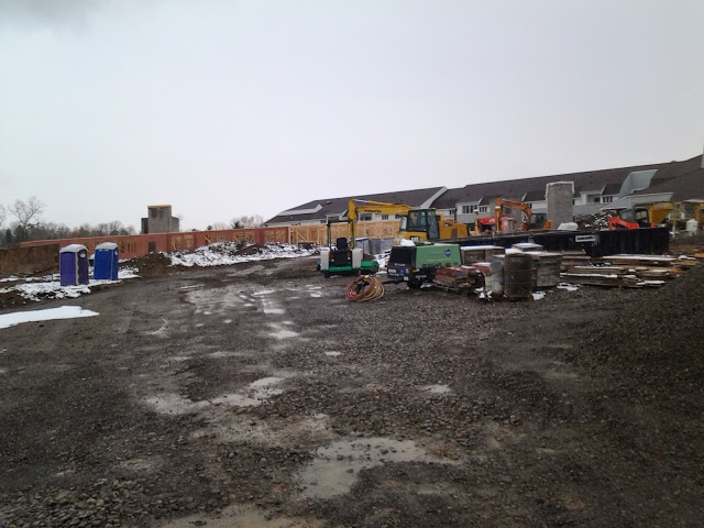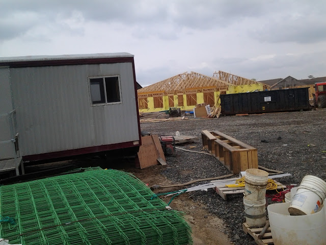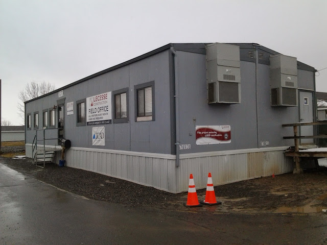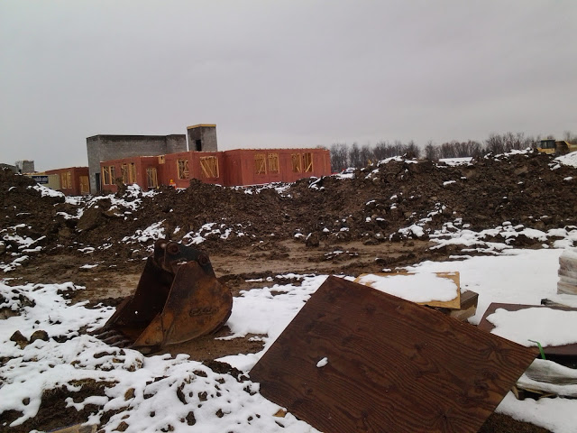 A sample wall on-site shows how the window installation and siding will look – the new addition will be designed to blend in with the original 20 year-old building. The newer photos are about a month old now, and since then many more windows have likely been installed in the rough openings of the apartment wing, and interior rough-in will kick in as the walls are framed out.