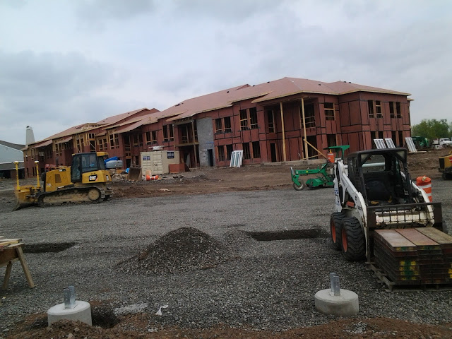 In the earlier photos from April, cinder block stairwells poke out from the first floor of framed and sheathed walls. The skilled nursing wing had yet to rise from ground-level.