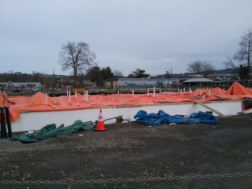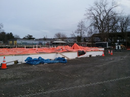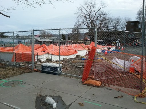 Continuing the theme of controversy with the project, by the time financing was secured for the now $17 million plan (up from $14 million in 2014), the building’s roof had become structurally unstable. The fear was that construction workers could be inside if it suddenly collapsed. An engineering report filed by Ryan Biggs/Clark Davis Engineering and Surveying in August led the city’s director of code enforcement to condemn the building. The initial demolition plan was to seal the building up and cart out the asbestos in sealed containers, a “contained” demolition. The new plan was to demolish on site with spraying to prevent airborne contaminants, a “controlled” demolition. This led to community protests, and the mayor threatened to torpedo the project unless a second engineering report was carried out by a third party engineer of the city’s choosing, with no affiliation to Travis Hyde. The second report, from Dende Engineering, confirmed the first report’s findings, so the city okayed, if somewhat begrudgingly, the new demolition plan. In response to the demolition, a neighboring couple wrapped their nearby home and rental buildings in plastic as a dramatic show of concern, which caught the attention of broadcast media.