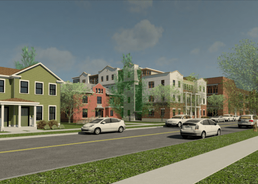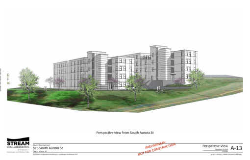 6. 815 South Aurora Street, aka “Overlook”, also continued its review at the planning board meeting. There were some minor design tweaks, seen in the before image (above) and after image (below). Changes in exterior colors, panels, ground-level entrances and fenestration, particularly on the side facing South Aurora Street. The fire trucks are to indicate that emergency vehicles will be able to safely pull in and out from the road. Overall, project size remains at 49 units and 141 bedrooms.